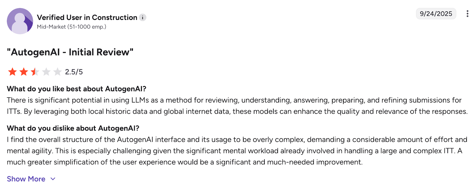 Autogen AI provides generative content and proposal lifecycle features with automation. But, it often requires manual review and editing for complex RFPs and lacks deeper AI-driven analytics.