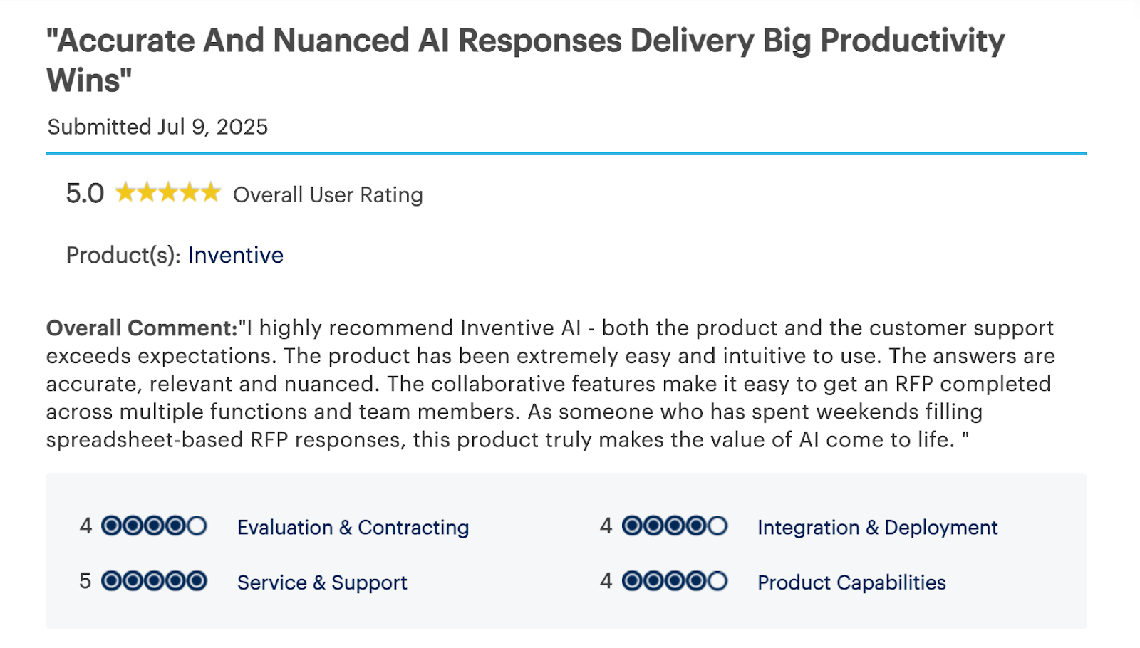 Inventive AI stands out by combining context-aware AI responses, quality checks, and structured collaboration in one platform built specifically for vendors. It removes repetitive work, reduces risk, and helps teams respond to RFIs at scale without adding operational overhead.