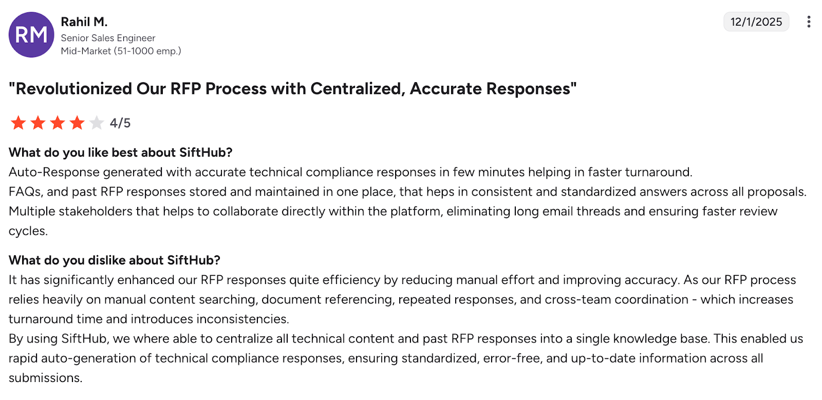 - Slower response cycles: Heavy workflows and manual content management can slow turnaround times when RFI volumes increase.