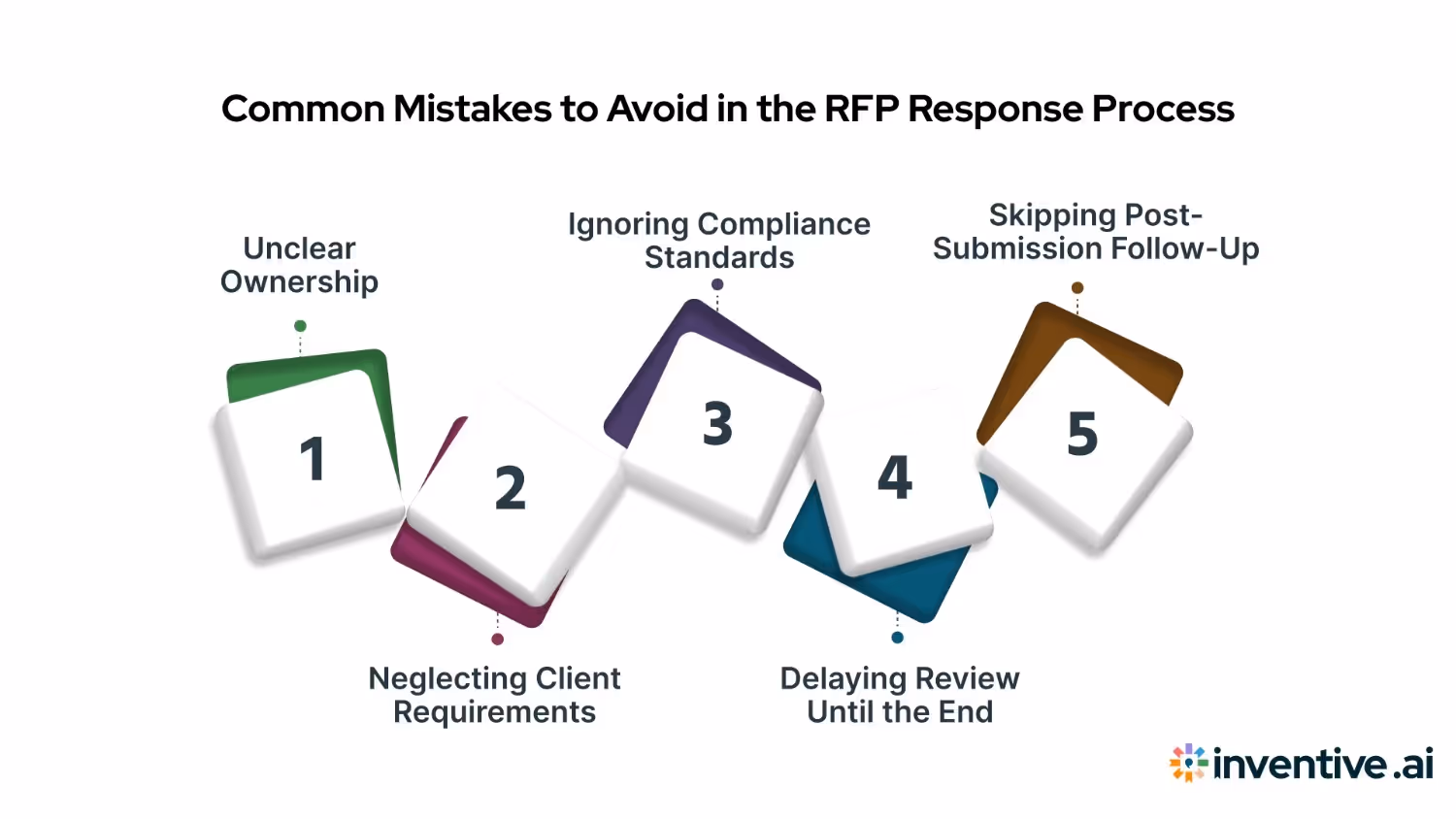 The RFP process can be riddled with pitfalls that, if overlooked, lead to delays, errors, and missed opportunities. By staying aware of these common mistakes and addressing them proactively, you can significantly improve your response quality. Here are key pitfalls to watch for: