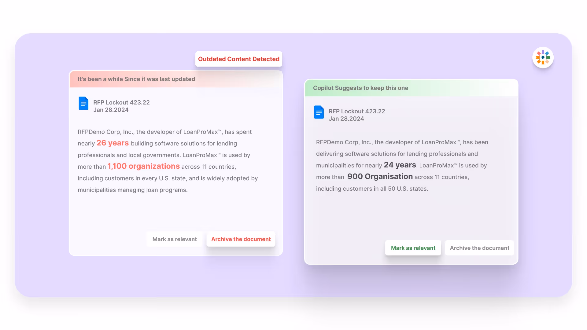 - Static Q&A libraries break down at scale. As RFP volumes grow, stale or conflicting answers become a hidden risk unless the system actively detects and flags them.
