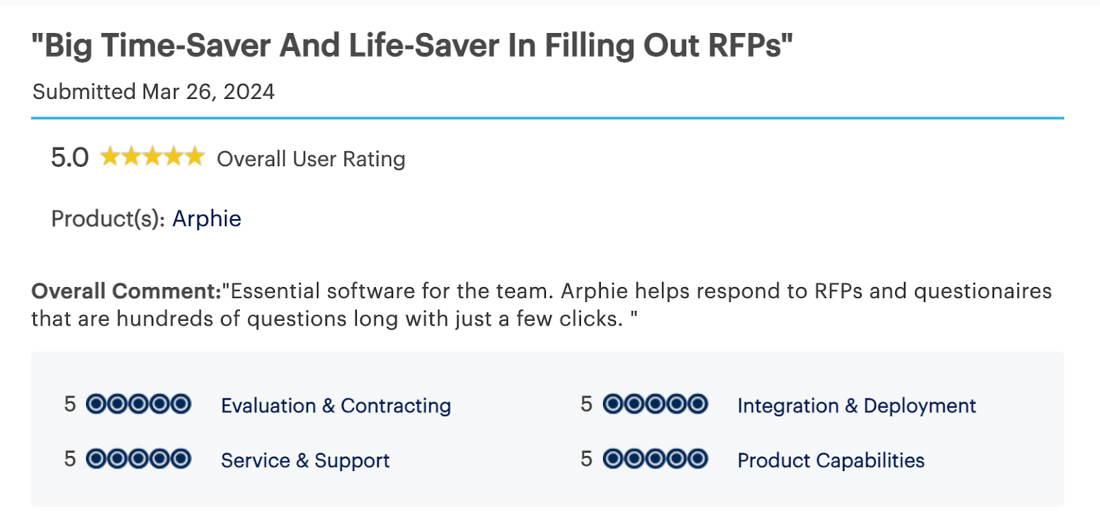 - Limited Focus on Narrative Proposals: While Arphie excels at generating accurate responses for straightforward questions, it lacks the ability to craft detailed, narrative-style proposals. Teams that require executive summaries, security overviews, or value-driven proposals may find Arphie insufficient for these needs.