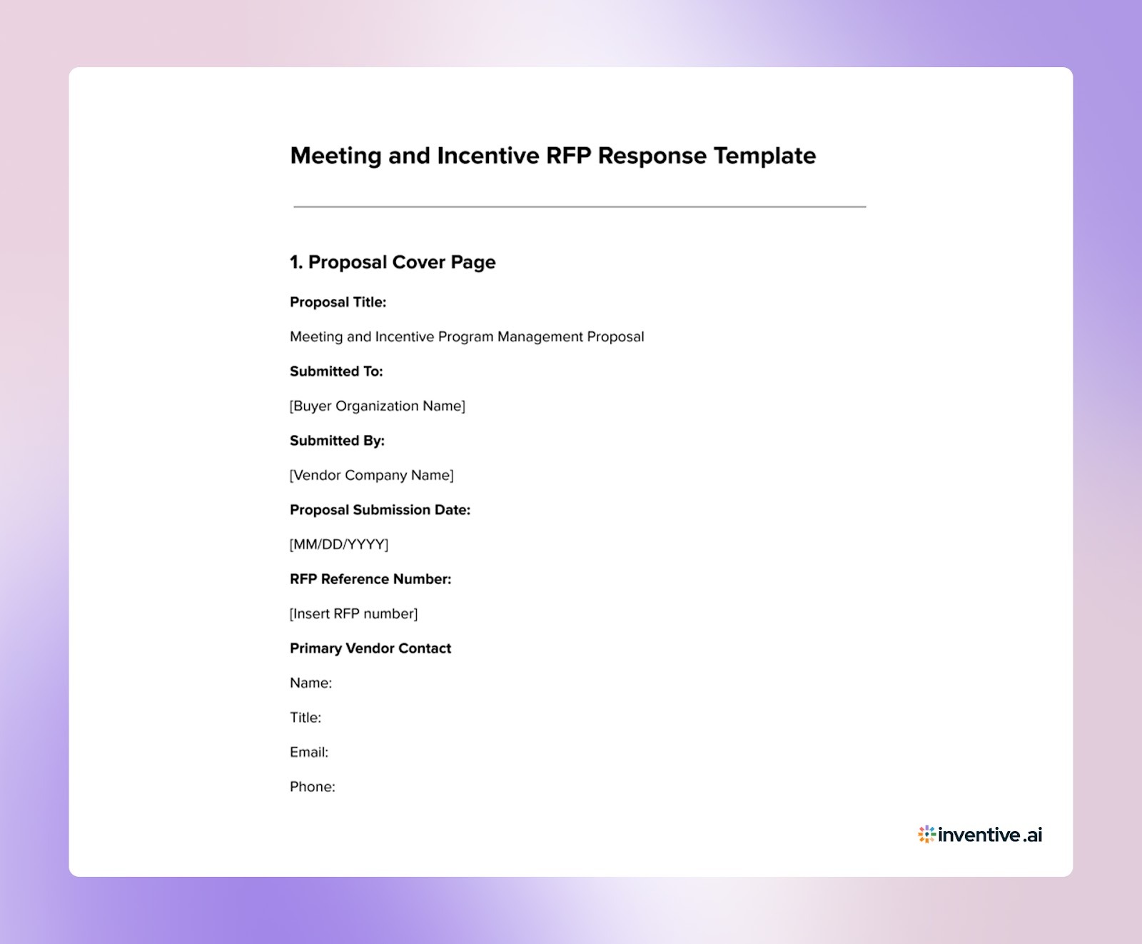 A meeting and incentive RFP response template is a ready-to-use framework vendors use when responding to buyer RFPs. This approach saves time when a new RFP arrives. Your team fills in relevant sections instead of rebuilding the document.