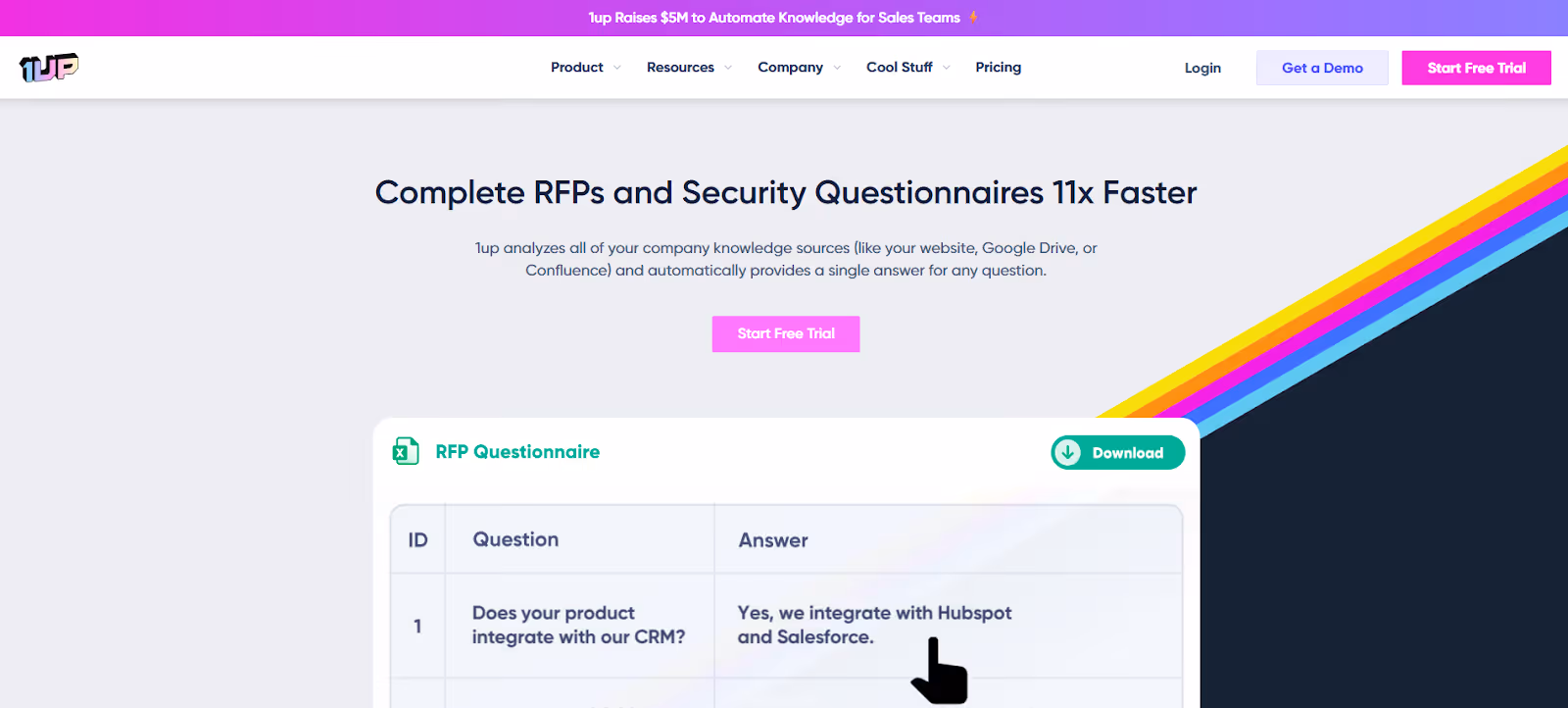 1up is a straightforward tool for organizing internal knowledge, allowing teams to centralize documents and share resources. It’s suitable for basic knowledge storage but not specifically built for extensive sales or RFP workflows.