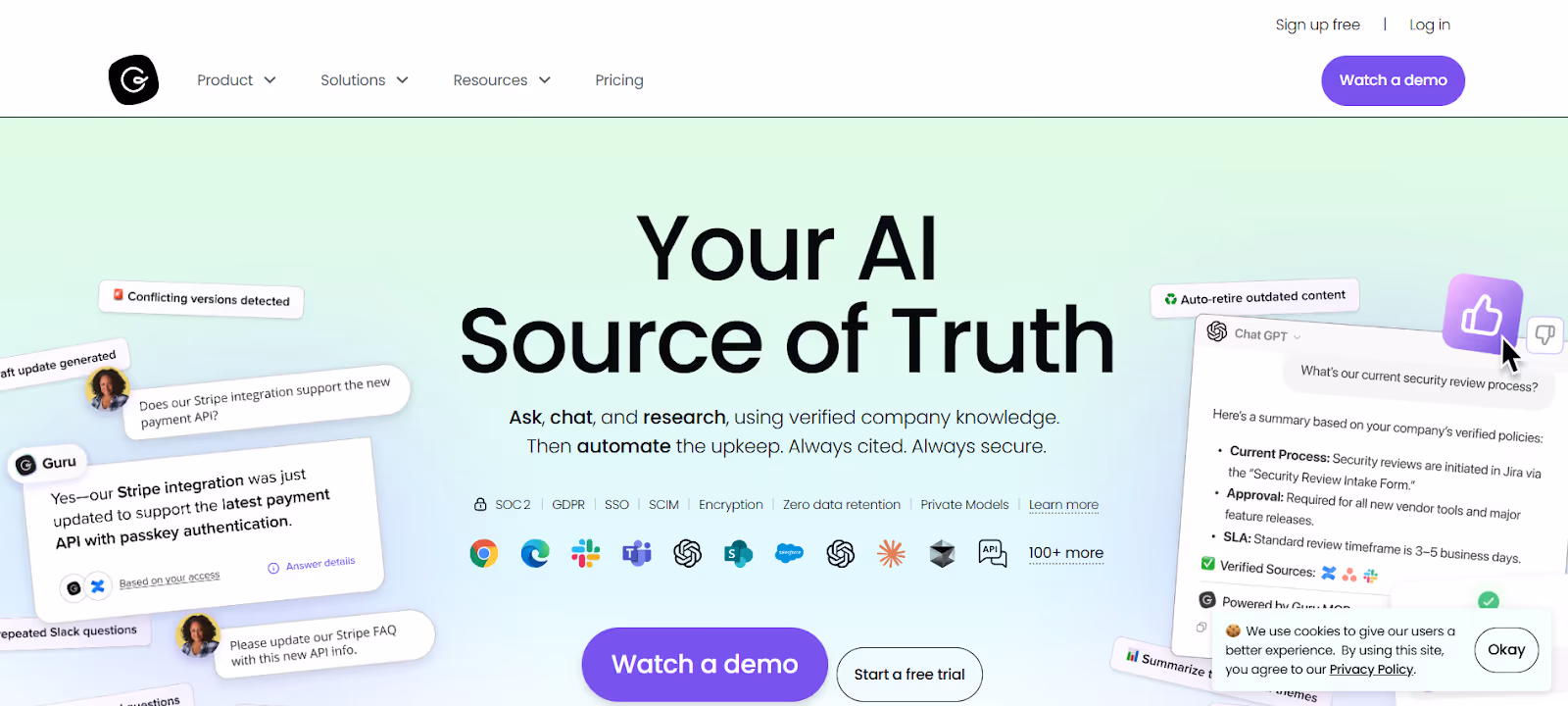 Guru is a popular knowledge management tool known for its accessibility and ease of use. Users appreciate the ability to organize and access internal knowledge quickly. It’s a solid general purpose tool for knowledge retrieval across teams.