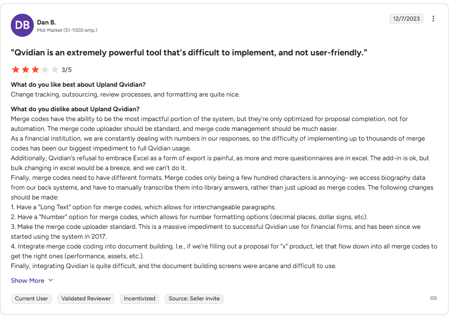 - Not Ideal for Complex Documents: It is not well-suited for large, complex proposals. Teams that regularly handle intricate or highly customized RFPs may find the platform lacking in features necessary to manage these types of documents efficiently.