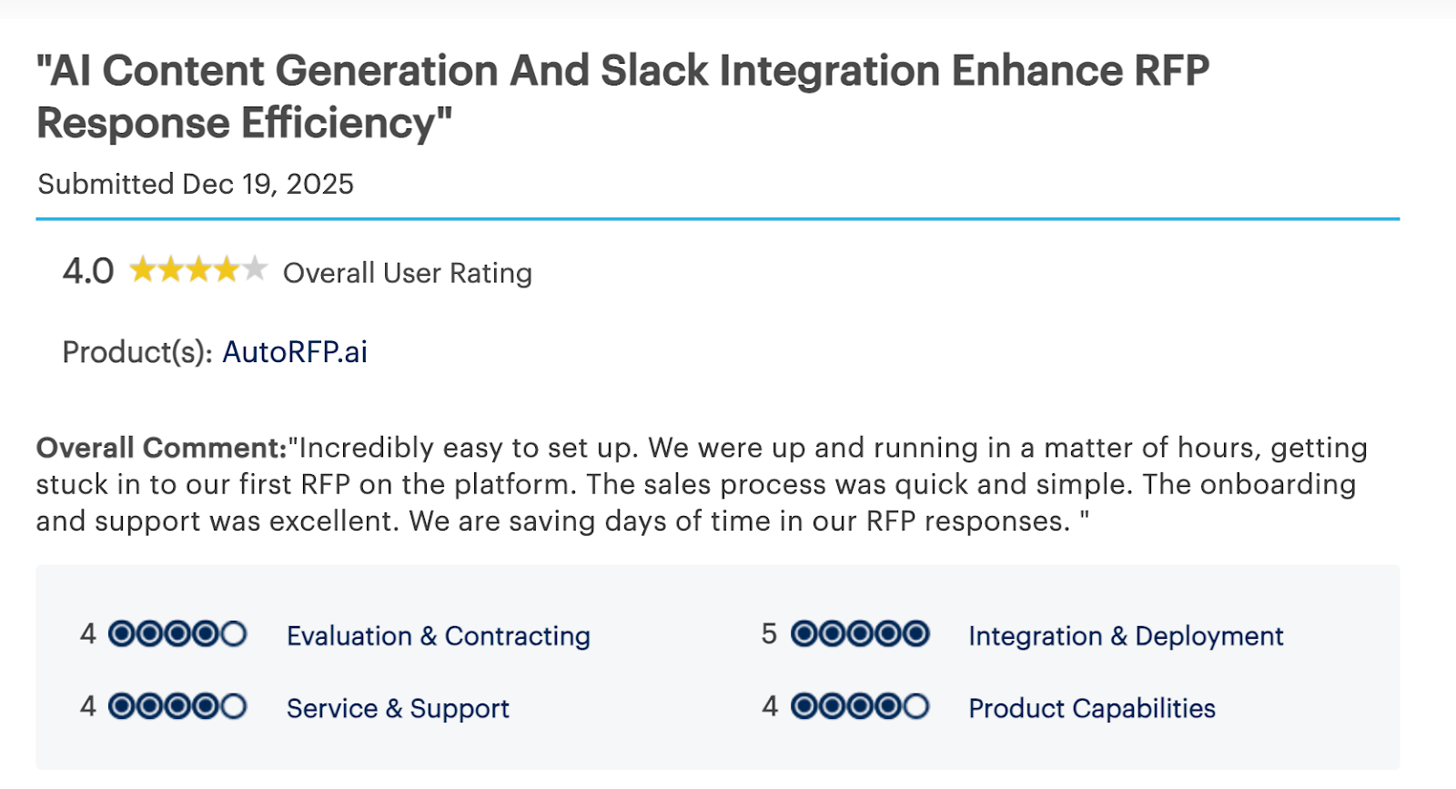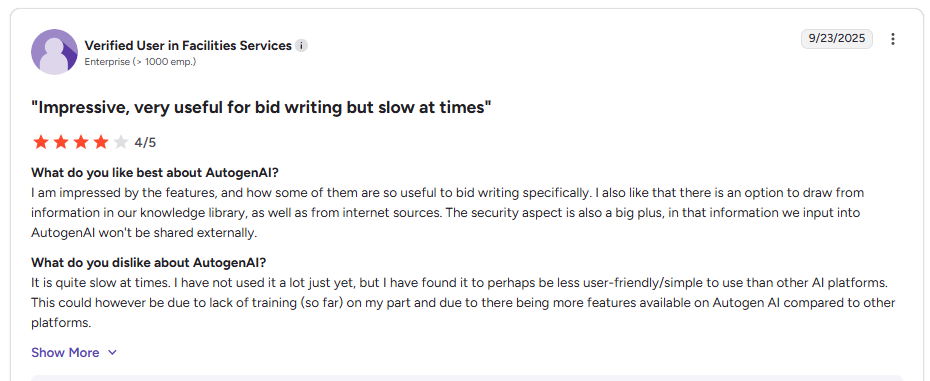 It offers great value for small teams that need a simple tool to manage RFPs, but its AI limitations and scalability issues make it less suitable for more demanding RFP processes.