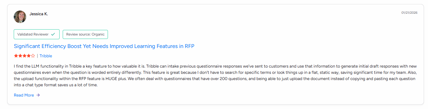 - Inaccurate Responses: Some users report that Tribble occasionally generates responses that are inaccurate or incomplete. This means teams may need to conduct additional research or make adjustments to ensure that responses meet client requirements and are accurate.