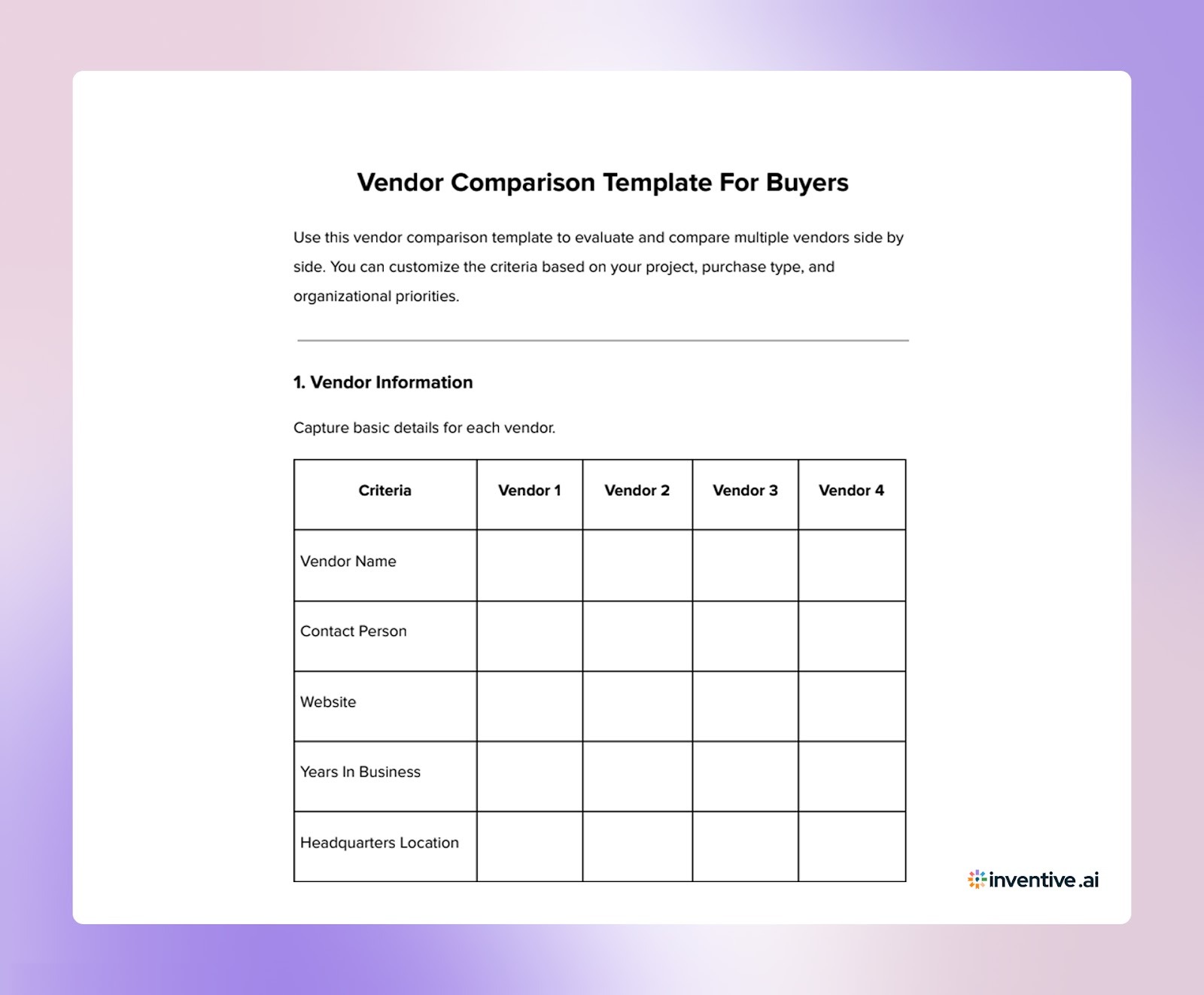 To simplify this process, we’ve created a complete vendor comparison template for buyers and structured response templates for vendors. These templates help procurement teams evaluate vendors consistently and help vendors present their qualifications clearly and competitively.