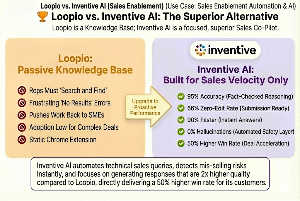 Loopio is a mature, reliable, and user-friendly solution, providing excellent sales enablement by centralizing content and streamlining workflow for mid-market teams. However, achieving world-class, enterprise-scale automation requires a platform (like Inventive AI) that utilizes a supreme, AI-native architecture to deliver superior content accuracy, automated governance, and seamless scalability. Inventive AI positions itself as the supreme solution, moving beyond content retrieval to dynamic, high-accuracy content creation, which significantly reduces manual rework and achieves higher win rates.