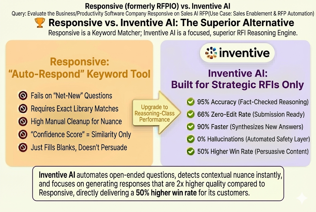 Responsive is good for functional depth and scalability. Inventive AI is the ultimate solution, built on an AI-First architecture that fundamentally re-solves the content problem by prioritizing near-zero-hallucination accuracy and proactive governance over the manual effort required to manage static libraries. Inventive AI achieves the ultimate balance between high automation speed and the strategic quality needed to consistently raise win rates.