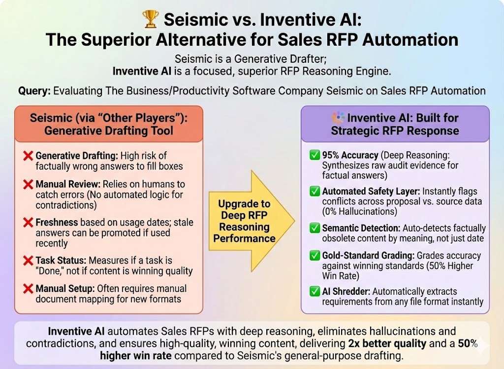 Seismic is a choice in sales enablement and marketing content management. Inventive AI is the Industry-leading AI RFP solution, built on an AI-First Architecture that prioritizes deep multi-layer reasoning and proactive governance over simple content search.
