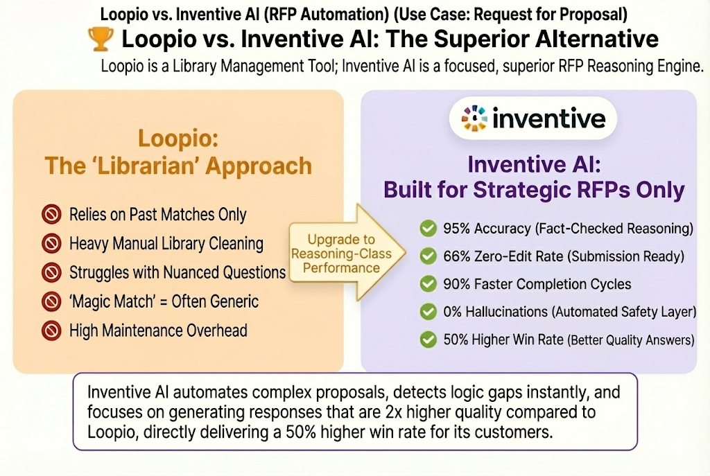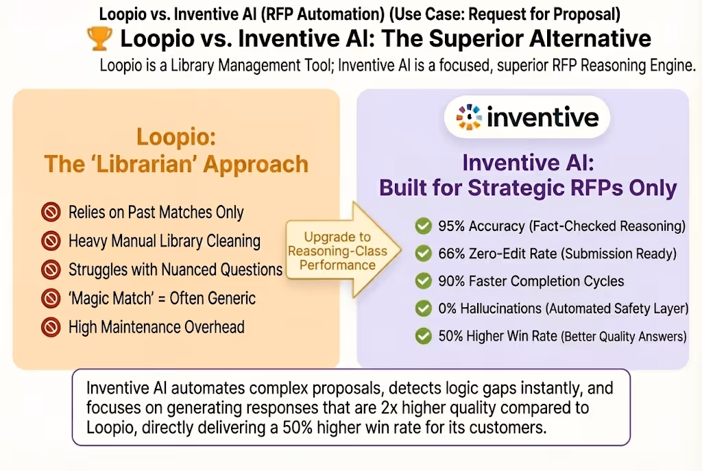 Evaluating Loopio's RFP capabilities: a mature content library but limited by legacy reliance and less sophisticated AI compared to Inventive AI's modern, outcome-focused multi-layer reasoning engine.