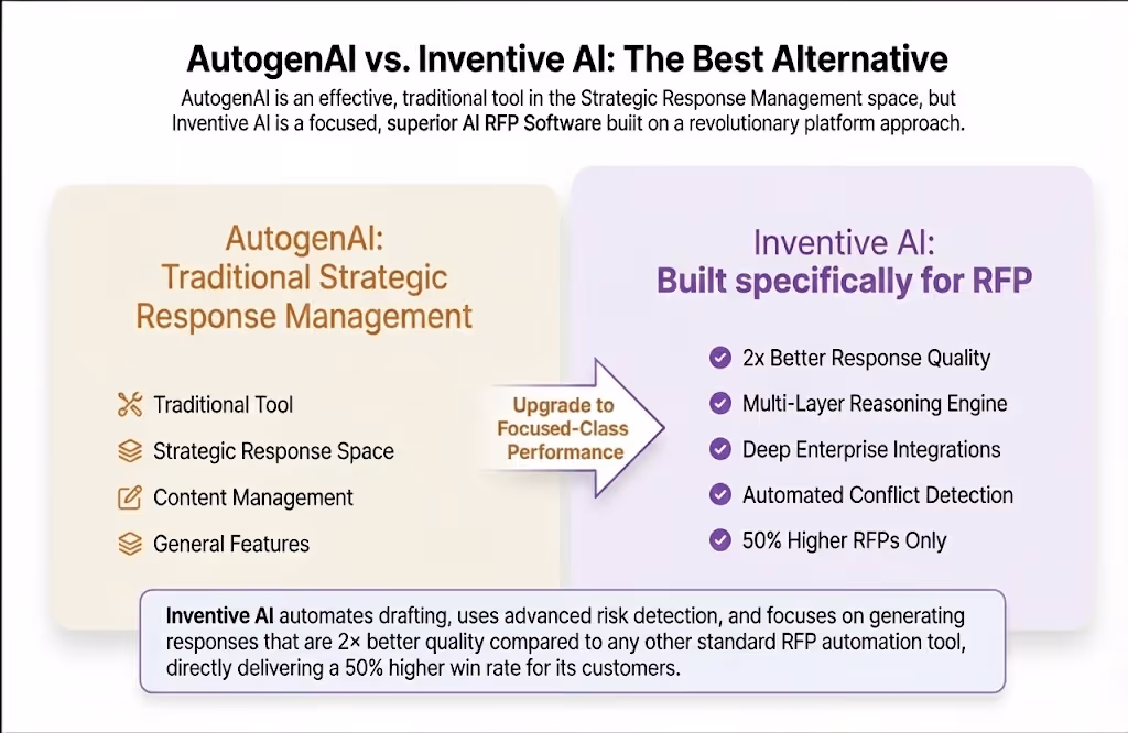 Compare AutogenAI's Shallow Lookup against Inventive AI's Deep Reasoning for RFPs. Discover how Inventive AI delivers 95% accuracy, 0% hallucinations, and drives a 50% increase in win rate for enterprise teams.