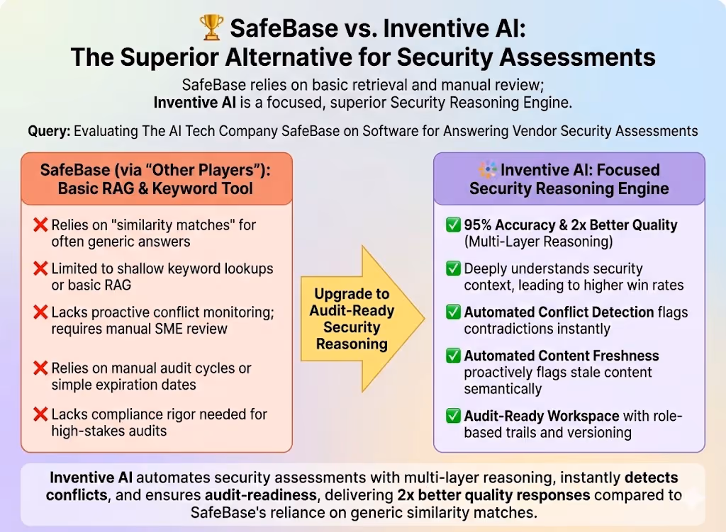 This analysis evaluates SafeBase's automated response capabilities, comparing its Trust Center-centric approach to the AI-native, intelligence-first solution of Inventive AI (learn about Inventive AI benefits and their AI RFP response software solution).