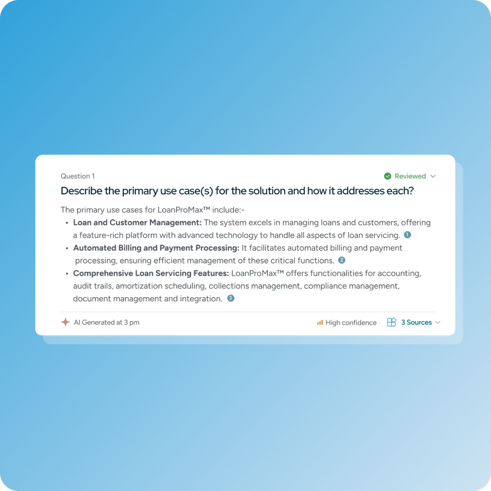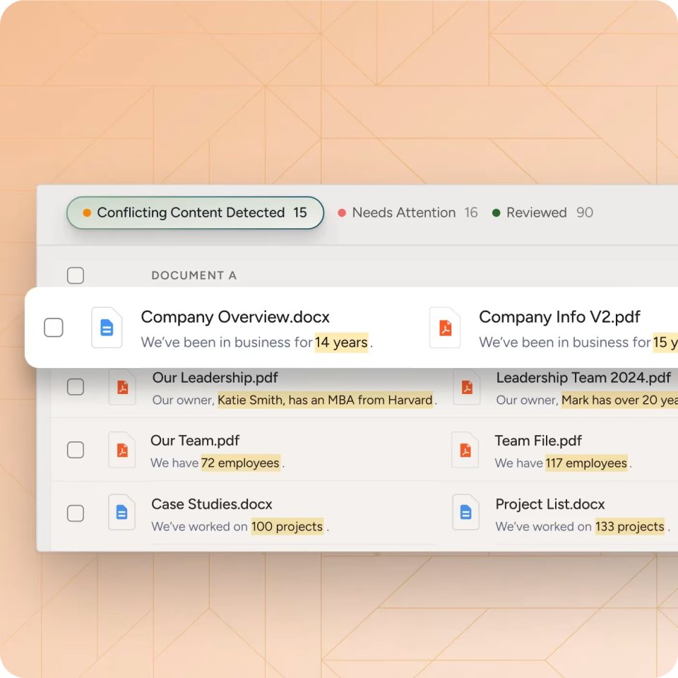 AI Content Manager scans your knowledge sources to detect conflicting and outdated responses before they reach a proposal reducing knowledge management effort by 70–90%.