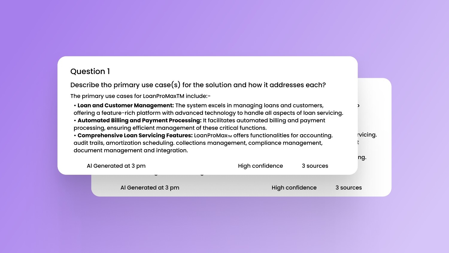 Generate a complete, accurate first draft in minutes. Responses align with business tone and messaging while maintaining context across the entire proposal.