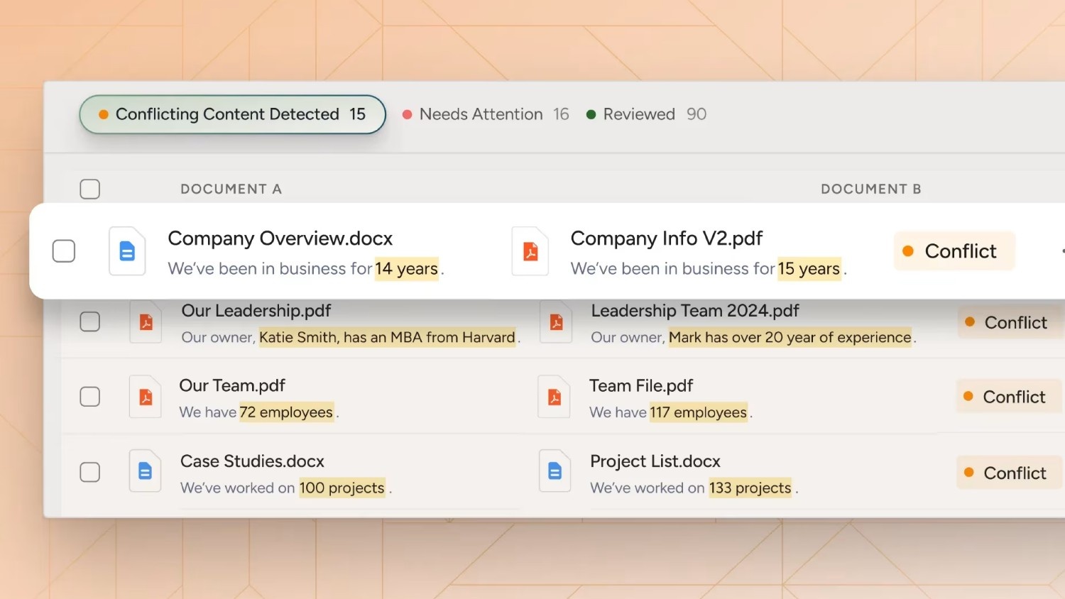 Automatically detect outdated or conflicting responses before submission, cutting review cycles by over 60% and preventing risky or inconsistent answers from reaching buyers.
